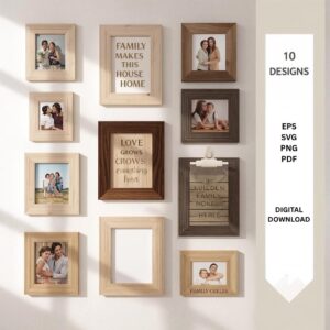 Beautiful Family Photo Frame SVG Bundle with 10 laser-cut designs. Perfect for home decor, personalized gifts, and wall art. Includes SVG, DXF, PDF, EPS, PNG, and JPG formats for laser cutting or CNC machines.