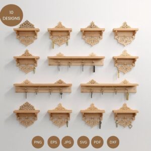 Laser-Cut Shelves with Key Holders Bundle β 10 unique digital designs for CNC and laser cutting. Includes SVG, DXF, EPS, PDF, JPEG & PNG files. Perfect for stylish home or office dΓ©cor!