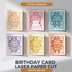 6 unique laser-cut birthday card designs π. Each includes name personalization & festive motifs like cakes, stars & balloons. Files: SVG, DXF, EPS, PDF, PNG. Perfect for birthdays of all ages!