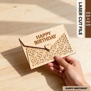 Create your own laser-cut Happy Birthday wooden envelope with this SVG template! π Features engraved text, heart clasp, and decorative design β ideal for digital makers and gift crafters. Includes SVG, DXF, EPS, PDF, AI, PNG formats.