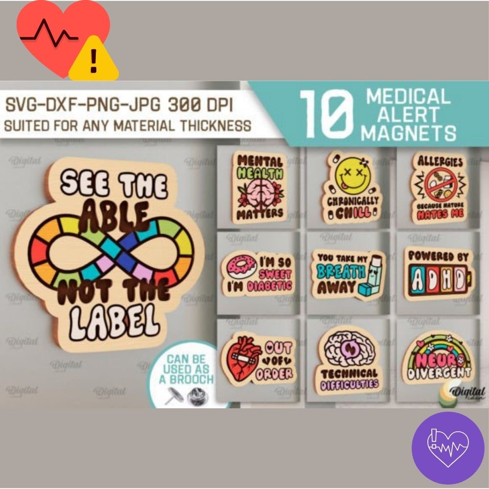 10 Medical Alert Magnets SVG Bundle | Neurodiversity Awareness | Laser Cut Files | CNC | Glowforge | Cricut