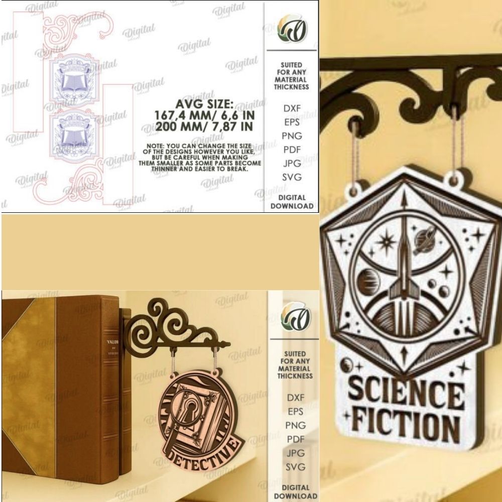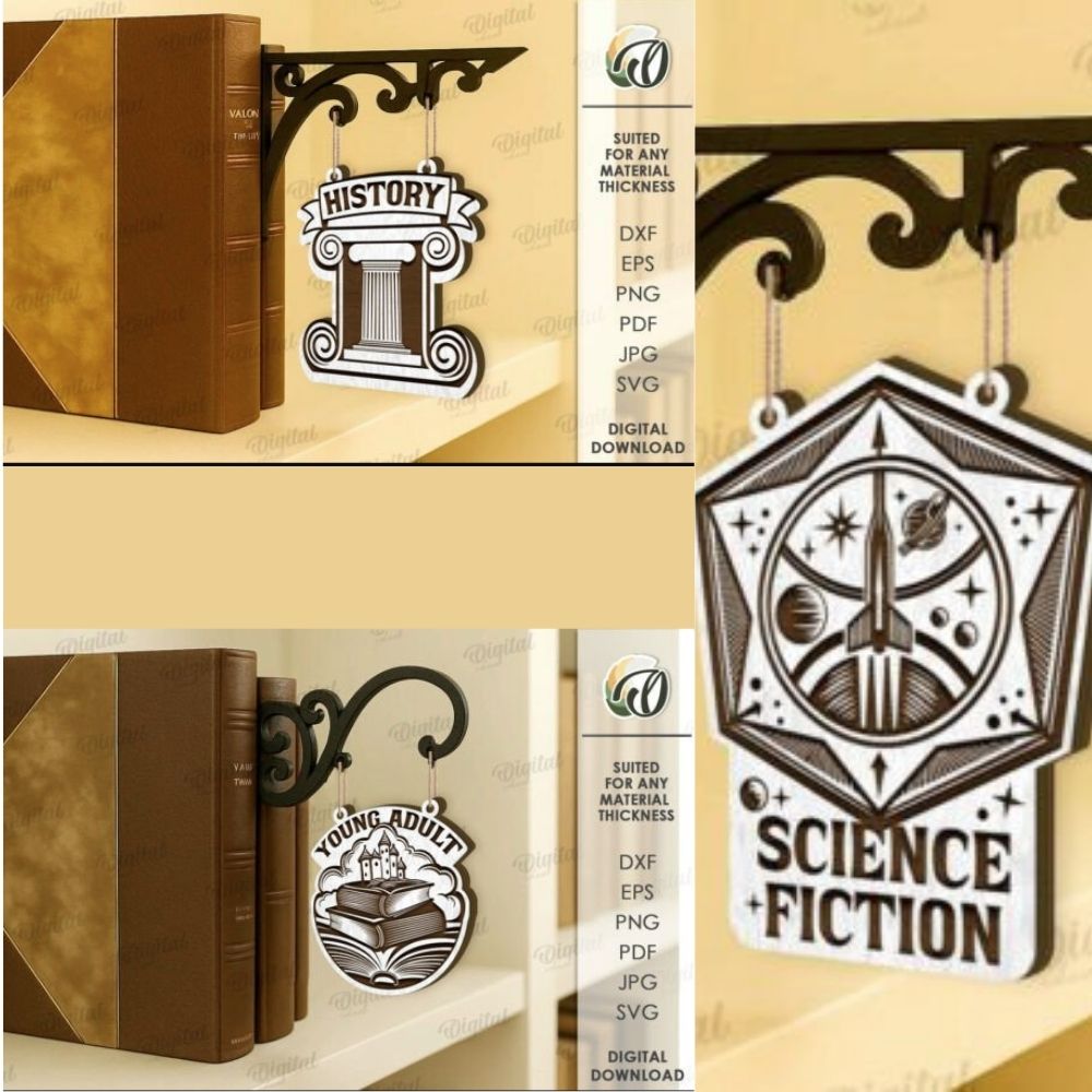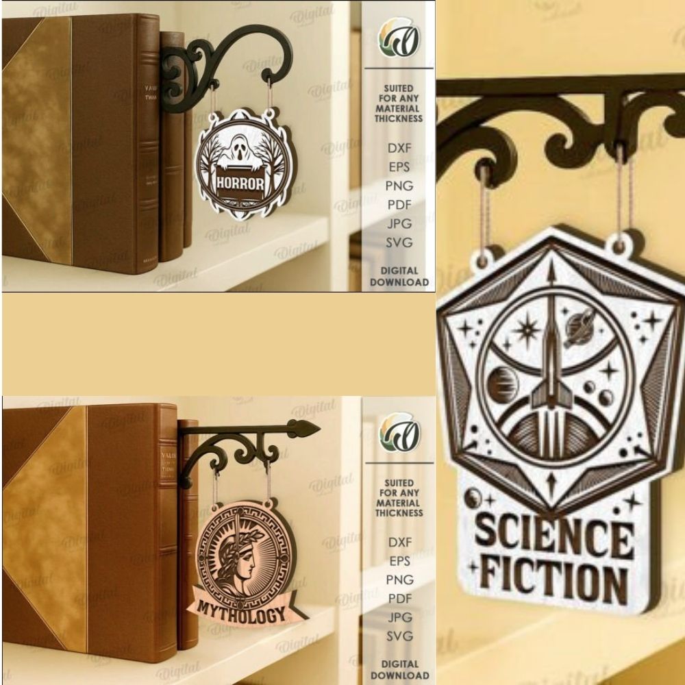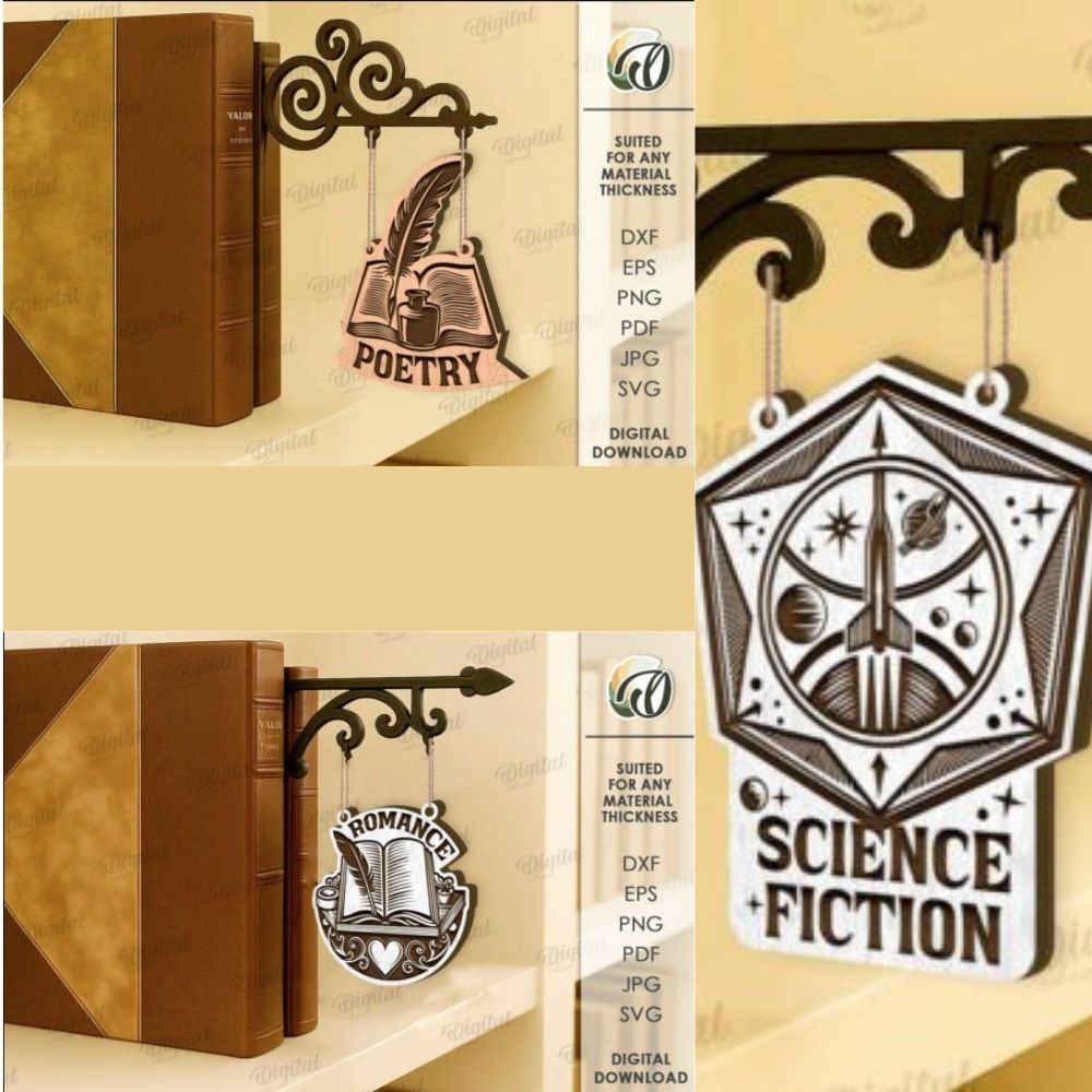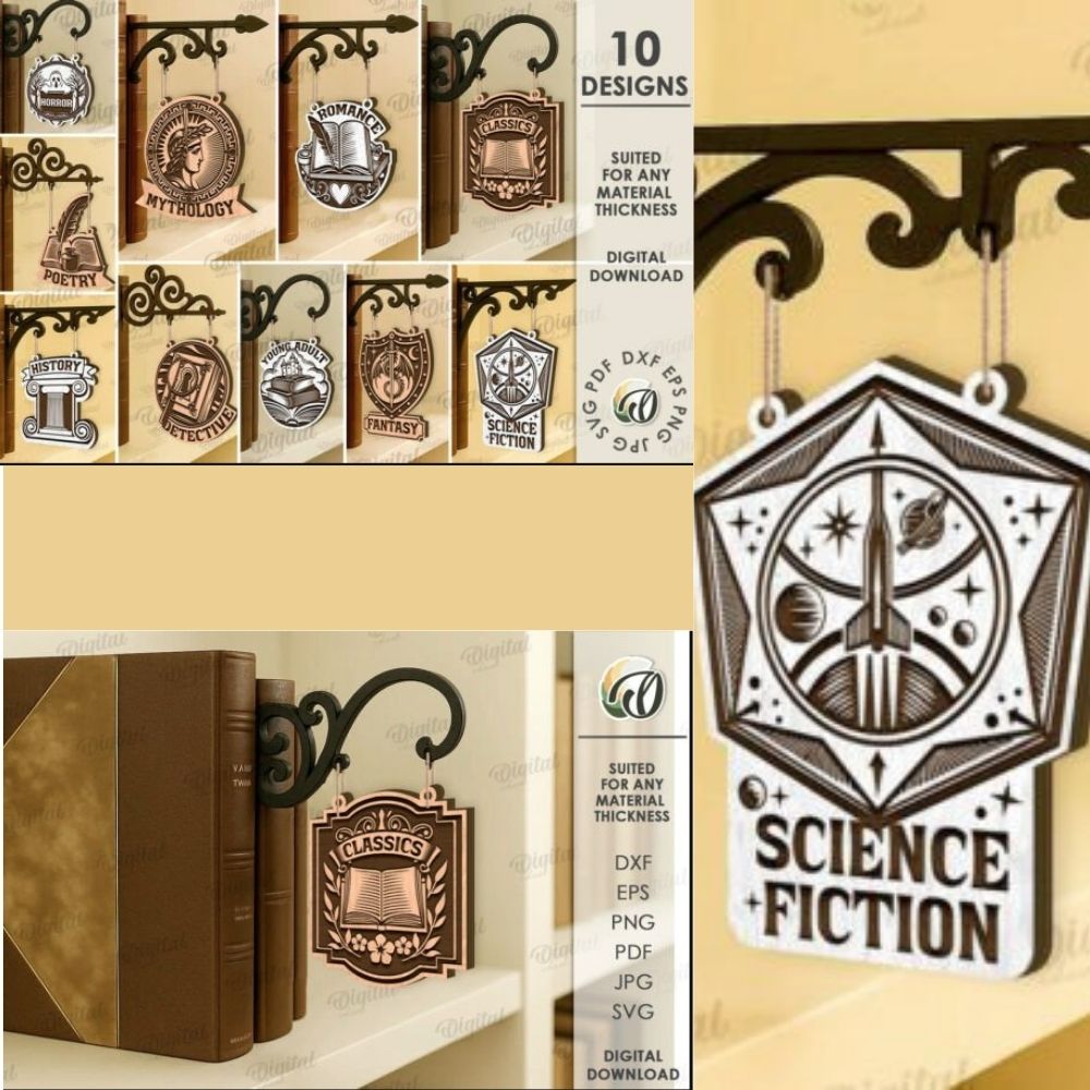 Add charm to your library or reading nook with this Book Genre Sign Laser Cut Bundle, featuring 10 ornate SVG designs for popular genres. Ideal for laser cutting and home or bookstore wall decor.