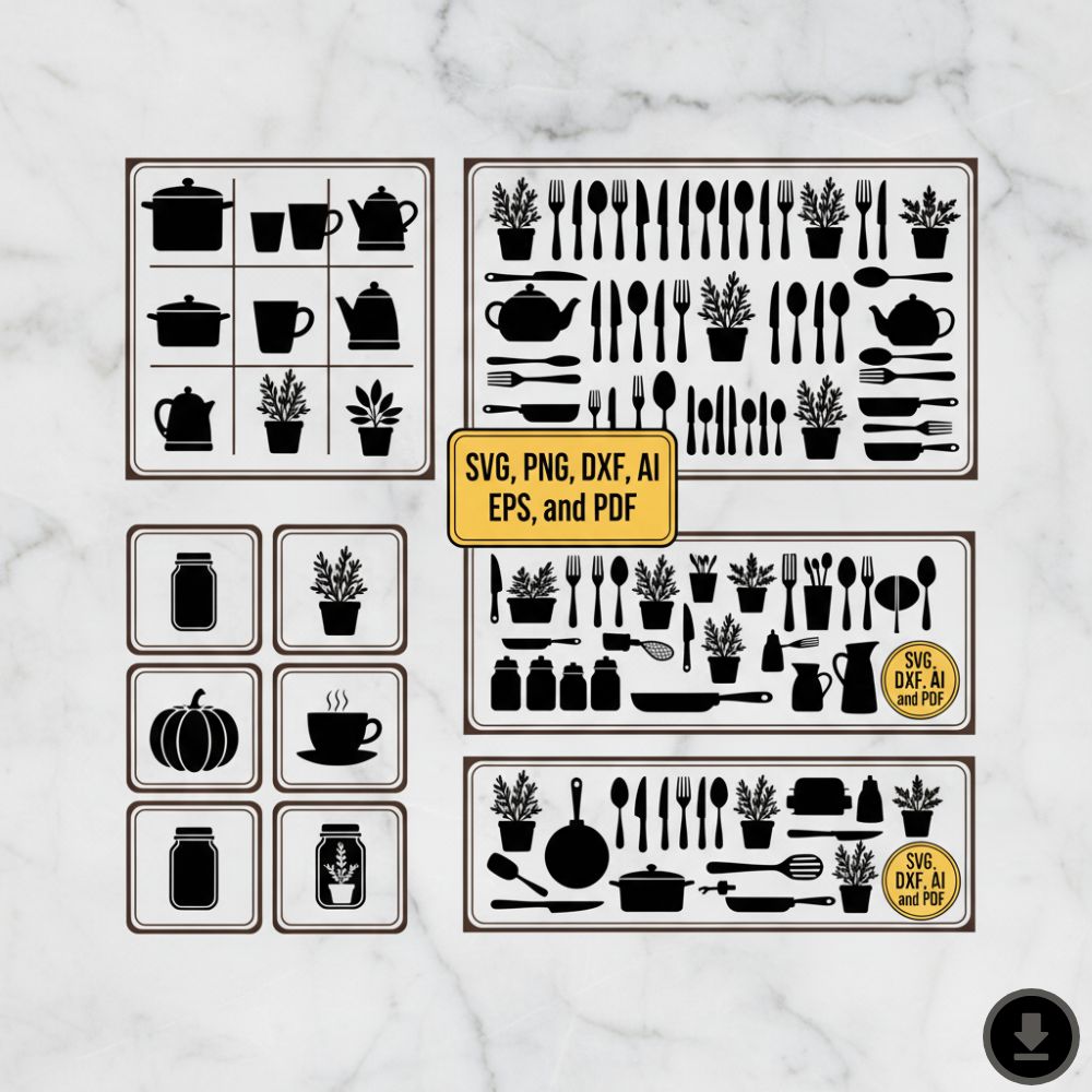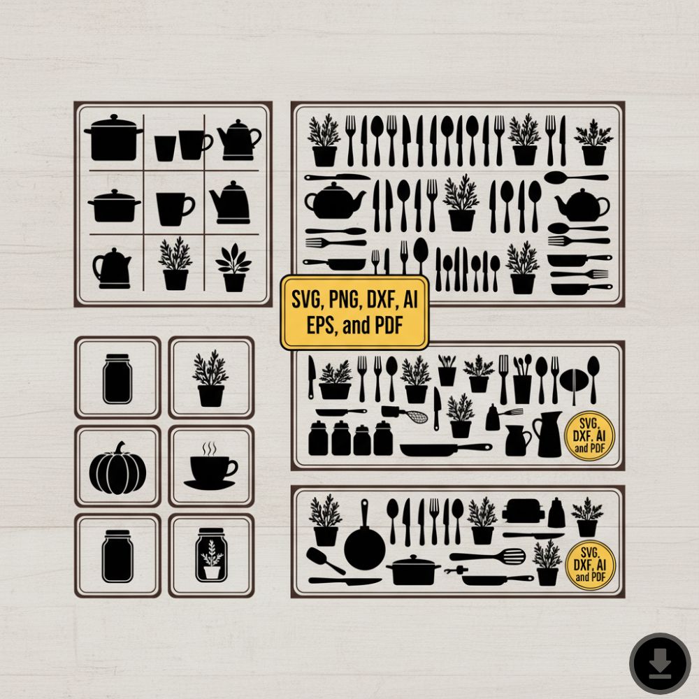 Youβll receive multiple file formats including SVG, PNG, DXF, AI, EPS, and PDF, ensuring full compatibility with your preferred design software. Whether youβre decorating your home, creating handmade gifts, or selling custom kitchen items, this digital bundle gives you everything you need to make your projects shine.
