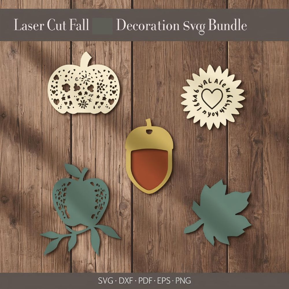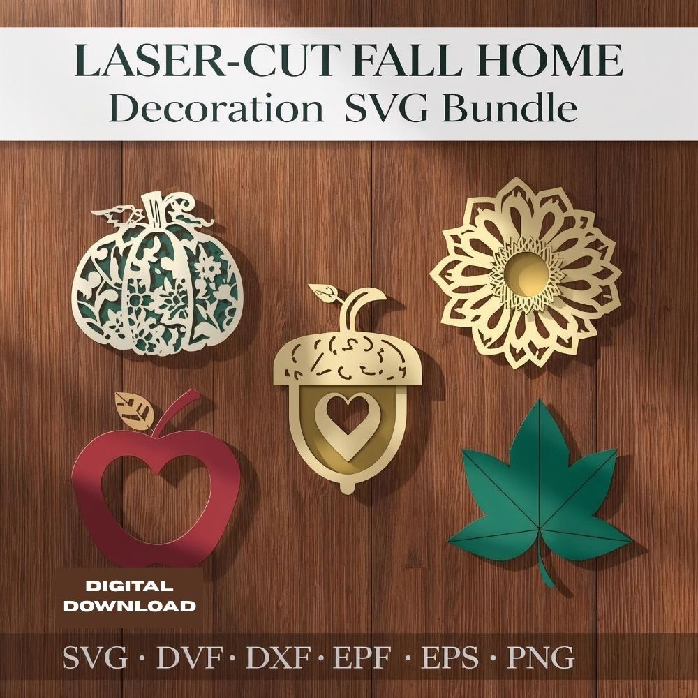 Bring autumn to life with this Fall Home Decoration SVG Bundle, featuring 5 layered laser-cut designs โ€” pumpkin, sunflower, acorn, apple & leaf. Perfect for Glowforge, Cricut, and DIY home decor projects. Instant digital download in SVG, DXF, PDF, PNG, and EPS.