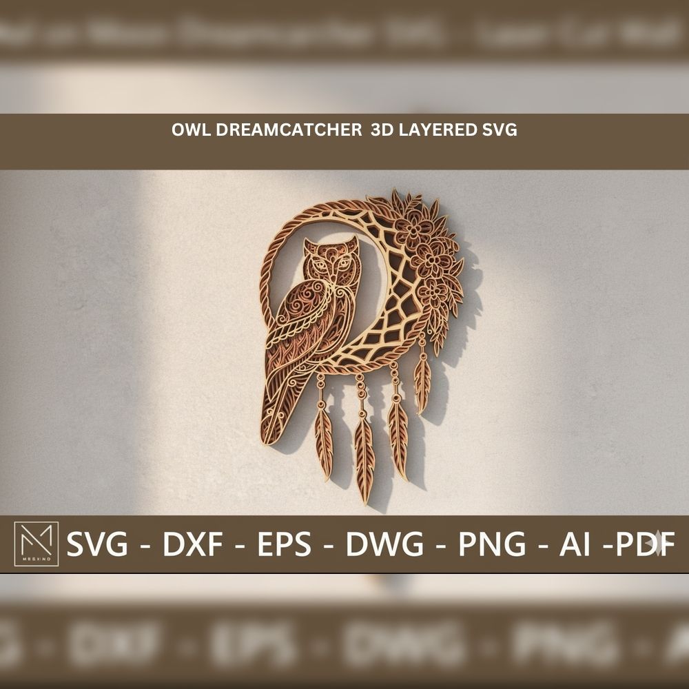 🦉🌙 Layered Owl on Moon Dreamcatcher SVG – a stunning 3D wall art design for laser cutting and CNC machines. Features intricate floral and feather details, ready in SVG, DXF, EPS, PNG, AI & PDF formats. Perfect for boho-style home décor or personalized gifts!