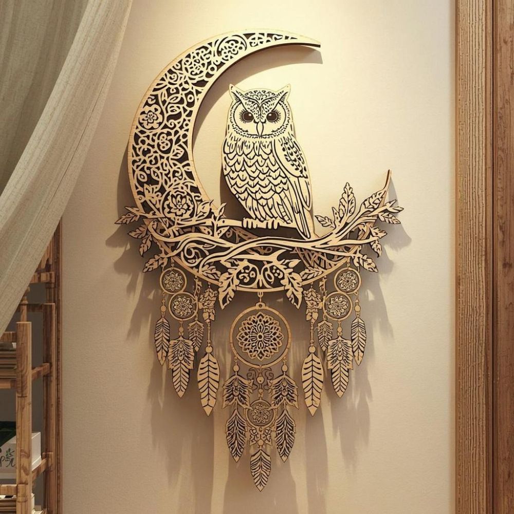 Layered Owl on Moon Dreamcatcher SVG | 3D Laser Cut Wall Art | Multi-Layer Boho Home Décor | CNC File Bundle