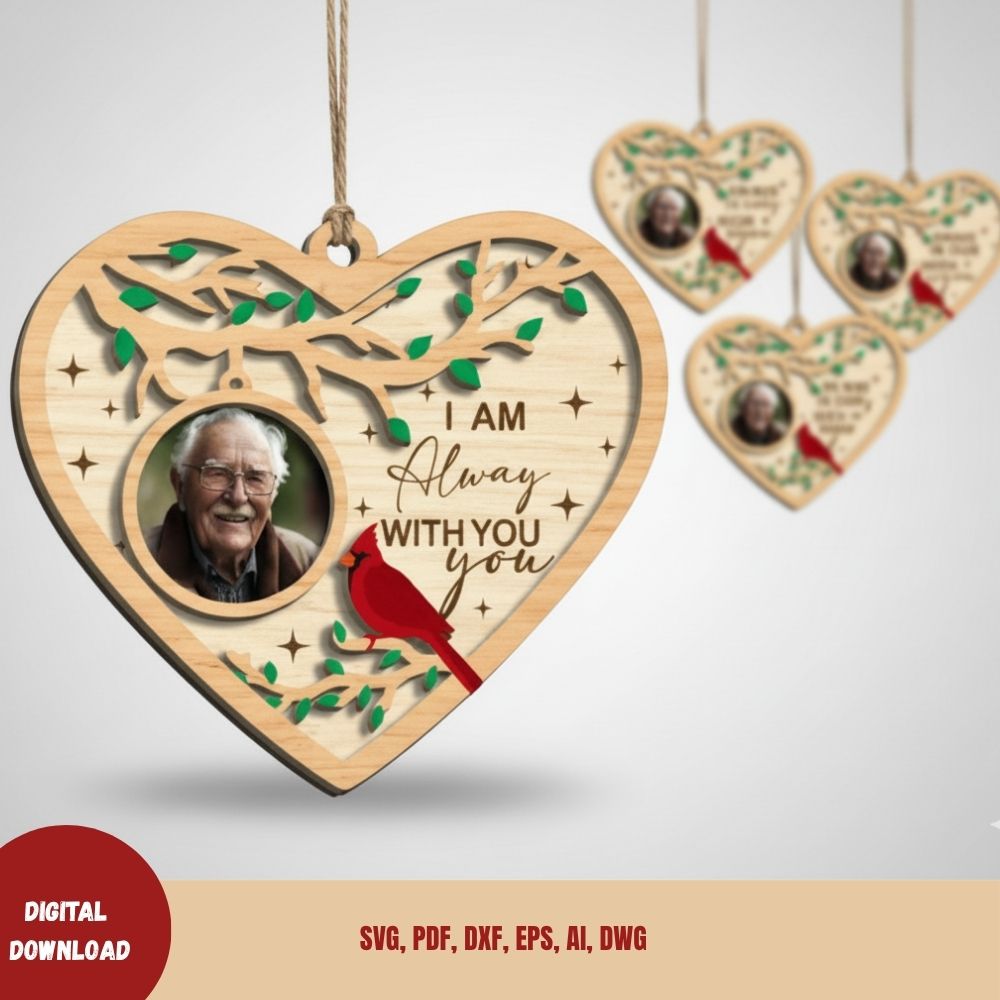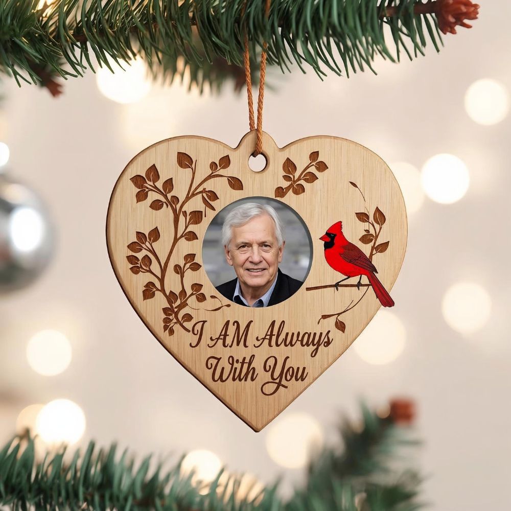 Each ornament features a heart-shaped wooden frame adorned with intricate branch and leaf cutouts, and a bright red cardinal β a timeless symbol of remembrance and comfort. These designs include photo slots for your loved ones, allowing you to create personalized memorial keepsakes that bring warmth to your holiday dΓ©cor.