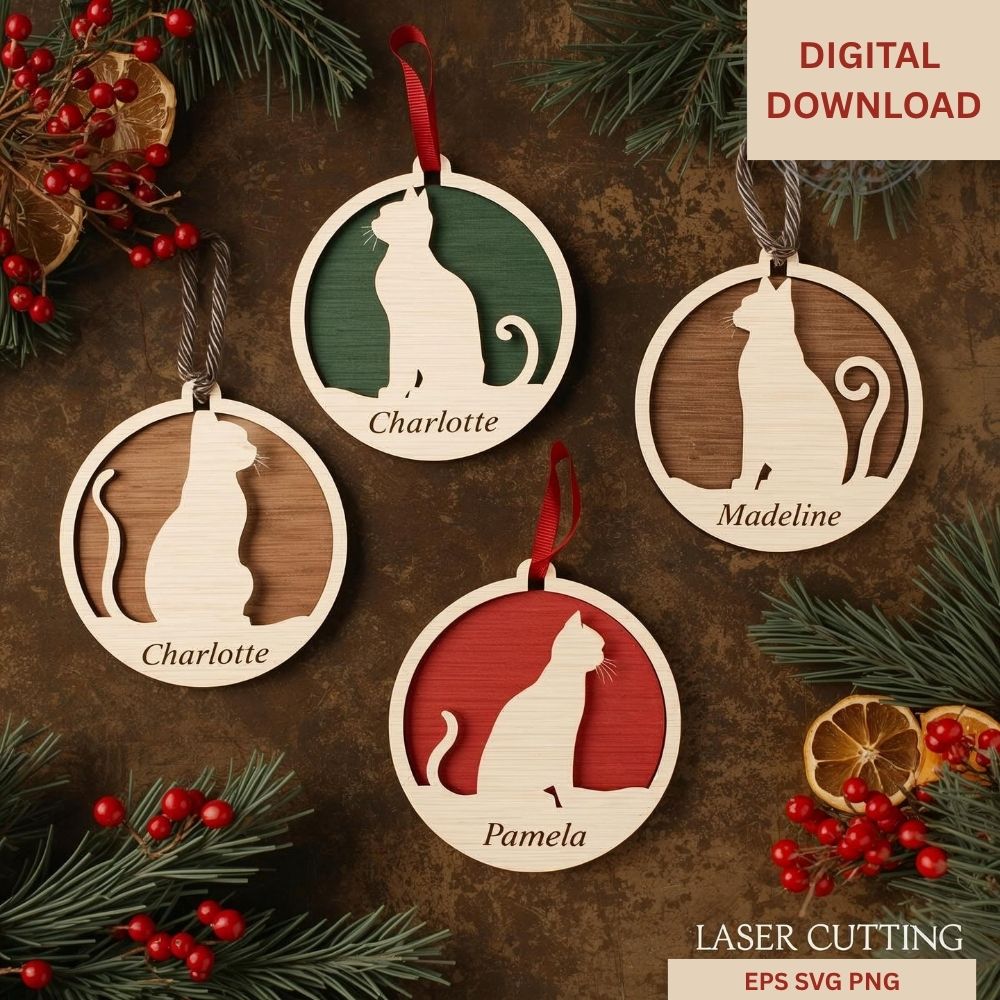 Personalized Cat Christmas Ornaments SVG Bundle | Laser Cut Layered Design | Custom Pet Name Decoration | Holiday Gift for Cat Lovers