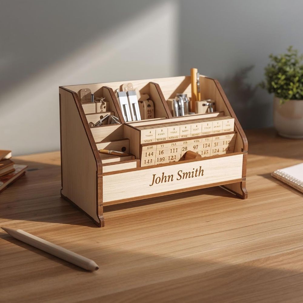 Upgrade your workspace with this elegant laser-cut wooden desk organizer that combines functionality and refined design πΏβοΈ. Crafted for precision and style, this organizer doubles as a pencil holder and perpetual calendar, keeping your desk both neat and inspiring.