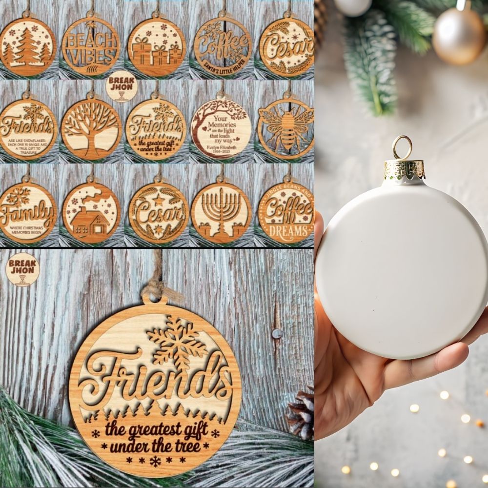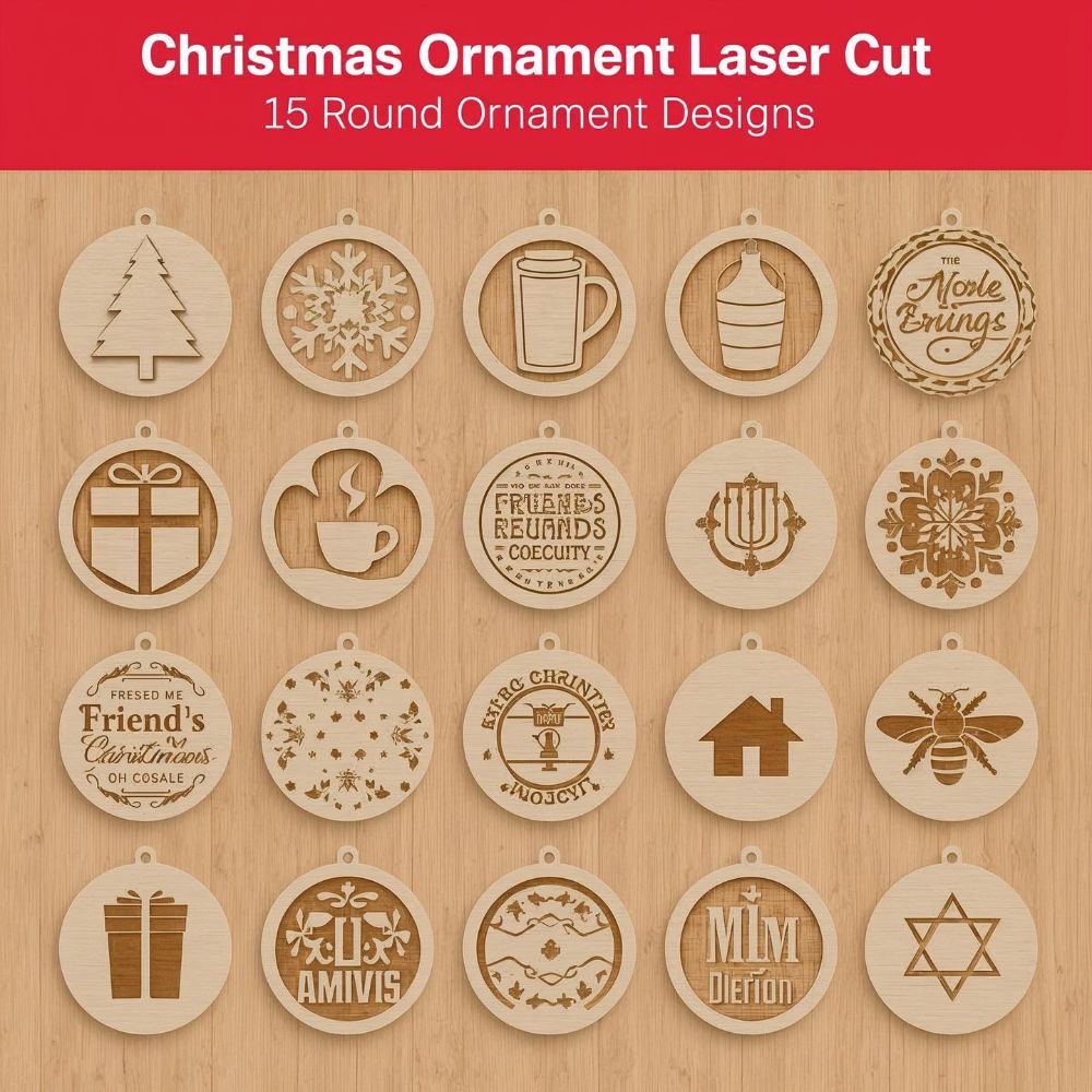 This festive set includes 15 unique round ornament designs, ideal for farmhouse Christmas dรฉcor, personalized gifts, and holiday crafts. Each design is crafted for smooth, detailed laser cutting and engraving โ€” perfect for wood, acrylic, MDF, or plywood.