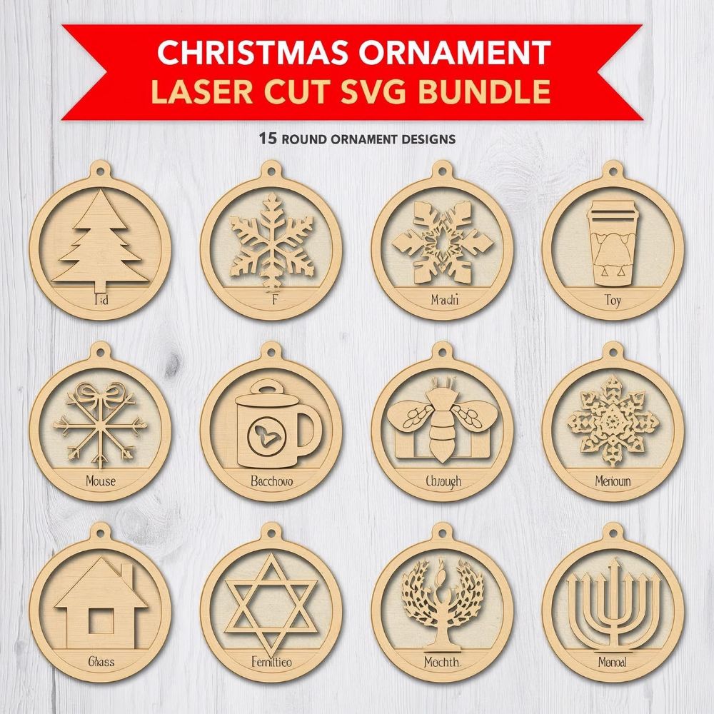 Round Christmas Ornaments SVG Bundle | 15 Laser Cut Ornament Files for Glowforge & Cricut