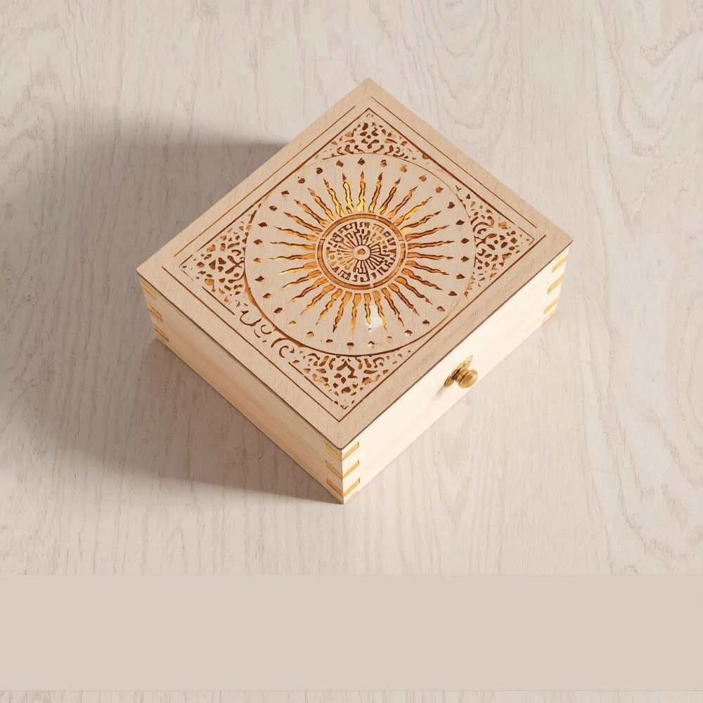 The intricate sun-inspired design adds warmth and elegance, while the customizable structure makes it perfect for painting, engraving, or personalizing as a gift box, jewelry case, or decorative keepsake.