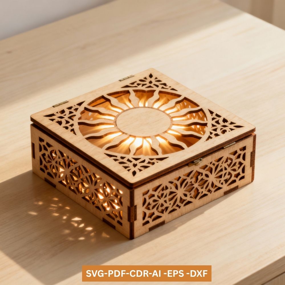 Beautiful Sun Design Jewelry Box SVG Template for laser cutting machines. Includes SVG, DXF, PDF, AI, EPS, and CDR files. Perfect for Glowforge, CNC, and Cricut. Create elegant gift boxes or home dΓ©cor pieces with ease!