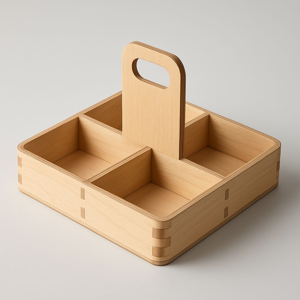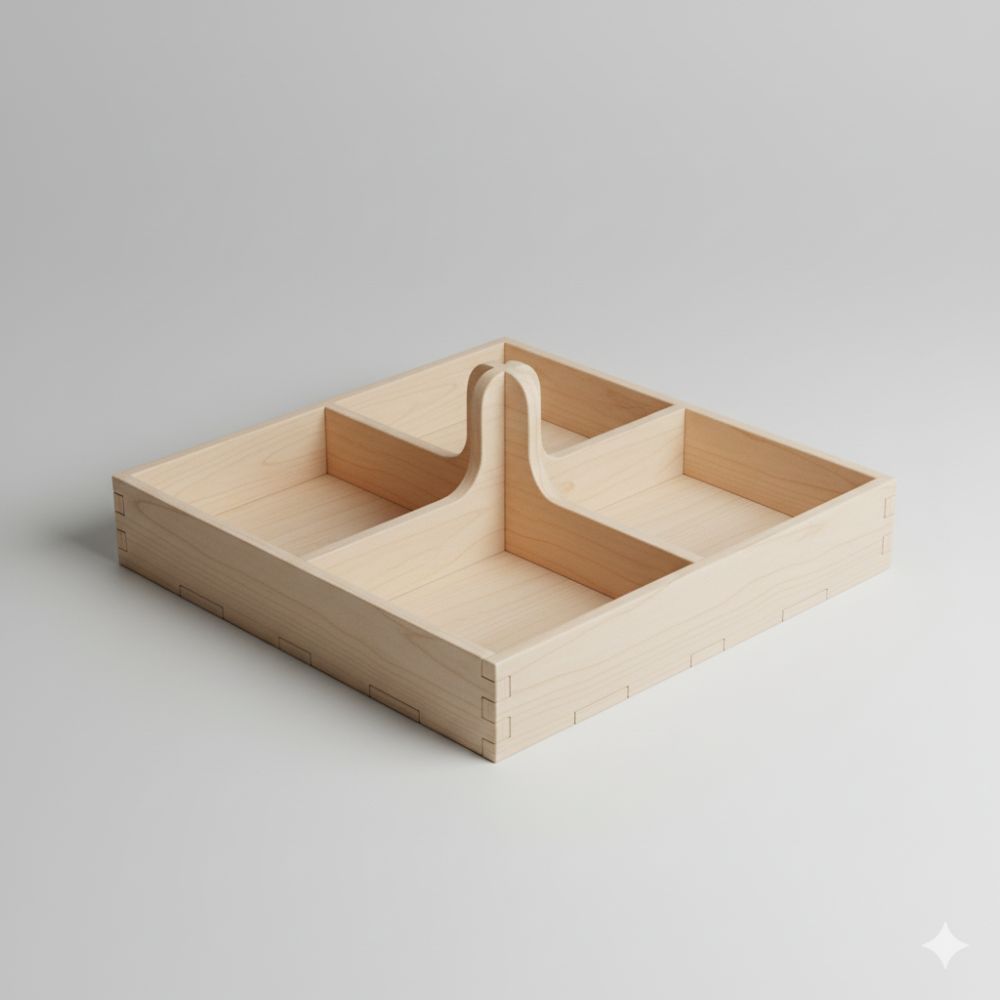 Versatile Wooden Divided Serving Tray SVG Laser Cut File with an integrated handle. Perfect for snacks, candies, or organizing small items. Glowforge/CNC ready, fits 3mm/1/8 inch materials. Includes SVG, DXF, PDF, AI, CDR.