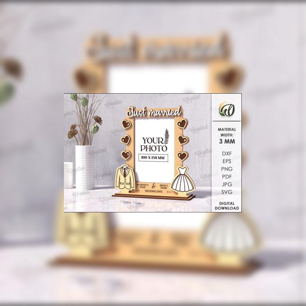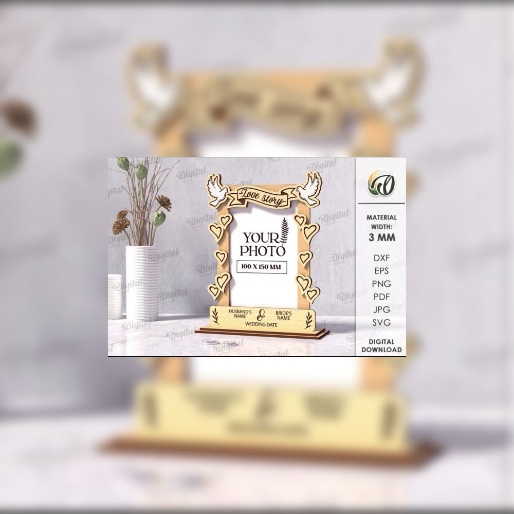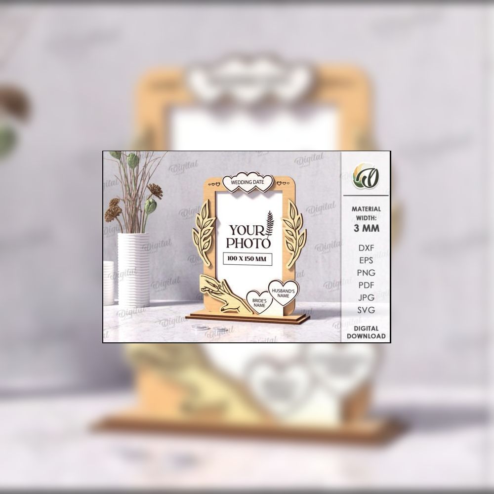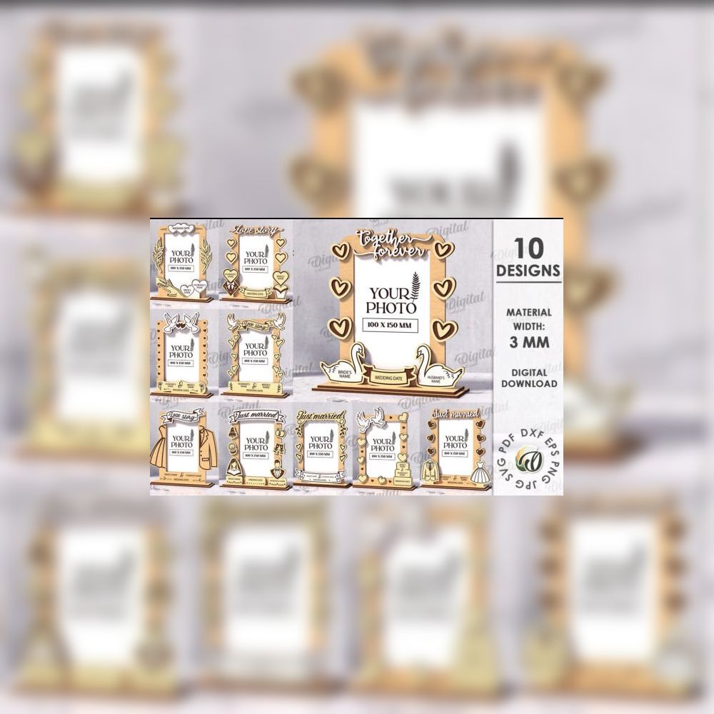 10 elegant laser-cut wedding photo frame designs ππΏ. Each includes customizable names & date fields. Formats: SVG, DXF, EPS, PDF, JPG. Perfect for romantic gifts & decor.