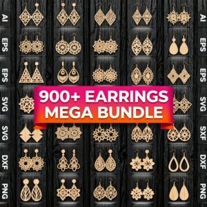 900+ laser-cut earring SVG designs featuring mandalas, geometric, floral, and teardrop motifs. Compatible with Cricut, Glowforge, CNC, and more. Includes AI, EPS, SVG, DXF, and PNG formats.