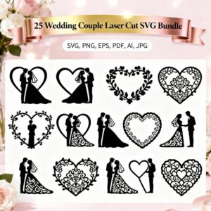 💍 Add romance to your crafts with this 25 Wedding Couple Laser Cut SVG Bundle! Elegant bride and groom silhouettes perfect for Cricut, Glowforge, and wedding décor. Includes SVG, PNG, EPS, PDF, AI & JPG formats for unlimited creative projects! ❤️